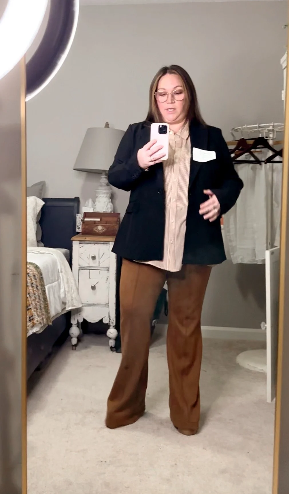 Caroline is wearing a pair of pull-on pants (4X) from Target, a ribbed shirt (4X) from Old Navy, a blazer (4X) from Madewell, and a pair of slip-on flats from Target.